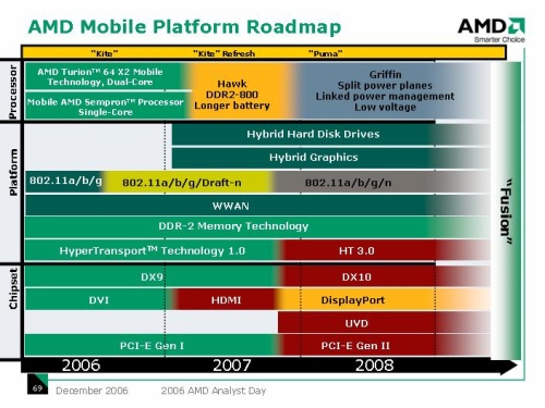 Примерно в те же сроки должна выйти новая версия мобильного процессора AMD Turion с кодовым названием Hawk, которая будет поддерживать память DDR2 800, меньше нагружающую батареи ноутбука. А в 2008 году появится мобильный процессор Griffin с пониженным напряжением питания и технологией split power planes, позволяющей включать или отключать отдельные ядра и функции мобильного процессора для экономии энергии.