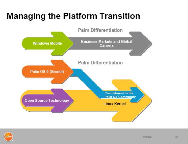 На конференции Palm анонсировала также мобильную платформу на базе Linux, которая должна стать новым фундаментом Palm. Она будет конкурировать с Symbian OS, хотя лицензировать эту платформу Palm не планирует.