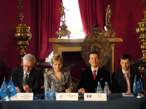 Генеральный директор музеев Московского Кремля Елена Гагарина и генеральный директор HP Россия Оуэн-Кемп (в центре) на пресс-конференции в Оружейной палате