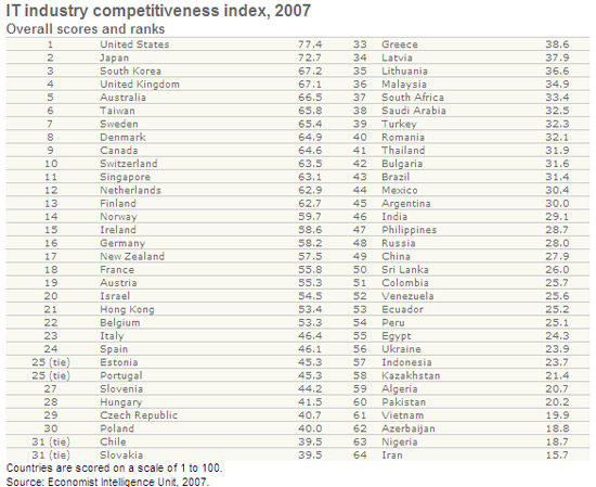 Журнал Economist подсчитал для 66 стран индекс конкурентоспособности ИТ-индустрии, основанный на таких факторах, как качество деловой среды.