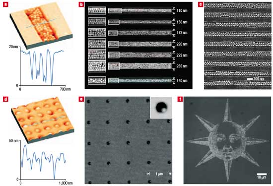 Другой экспериментальный метод расположения частиц представляет собой наноимпринтинг, когда шаблон вдавливается в слой материала. Эта техника позволяет наносить линии шириной несколько нанометров.
