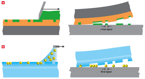 Сначала частицы прецизионно наносятся на мягкую эластичную подложку, к которой затем прижимается стеклянная или кремниевая пластина, так что рисунок переносится на нее.