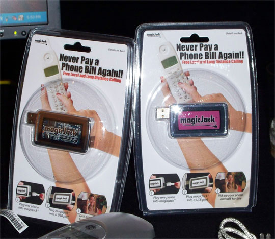 В четверг два ветерана телекоммуникаций представили устройство MagicJack размером со спичечный коробок, которое играет роль телефонной розетки для ПК и позволяет индивидуальным пользователям или малым предприятиям, подключив к нему обычный телефонный аппарат, дешево звонить по местным и междугородним номерам.