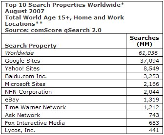 Второе место в мировом рейтинге занимает Yahoo с 8,5 млрд операций поиска, а третье — китайская поисковая машина Baidu.com с 3,2 млрд операций. На четвертом месте веб-сайты Microsoft с 2,1 млрд операций поиска, а на пятом — корейская Naver.com, принадлежащая NHN Corp., с 2 млрд операций.