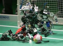 Несколько роботов-гуманоидов, принявших участие в играх Robot Athletic Meet 2007, опрокинулись в результате столкновений на поле, и каждое их движение сопровождалось натужным гудением моторов.