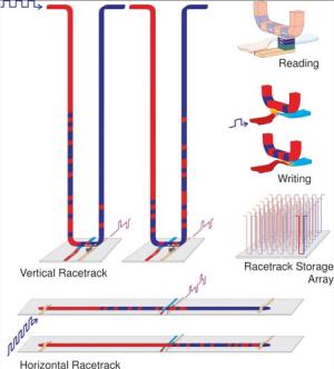 Твердотельная память нового типа, которую IBM называет racetrack-памятью, сочетает в себе главное преимущество флэш-памяти — отсутствие движущихся частей — с дешевизной магнитных носителей, что должно привести к появлению надежных и долговечных недорогих энергонезависимых запоминающих устройств большой емкости и с высоким быстродействием.